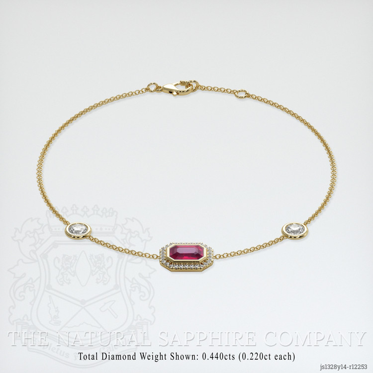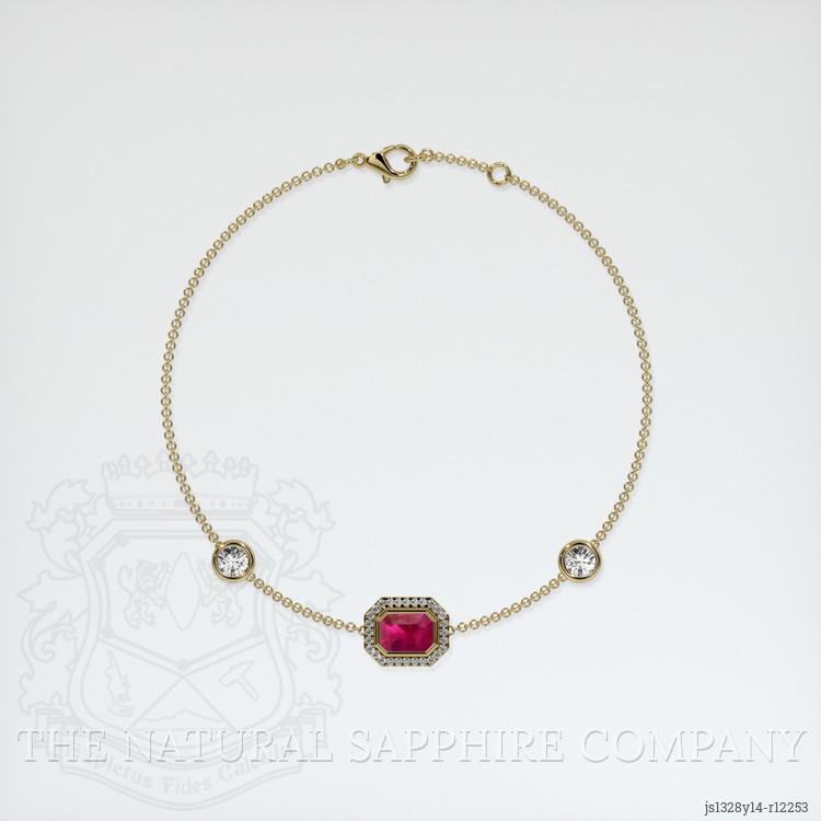 The bracelet features a beautiful, transparent 1.08 carat emerald cut shape pinkish red ruby with the dimensions of 6.91 x 5.10 x 3.20 mm and a emerald cut. It has a clarity grade of very slightly included (evaluated at eye level), vivid color saturation, and an excellent polish. The origin of this ruby is Burma (Myanmar).