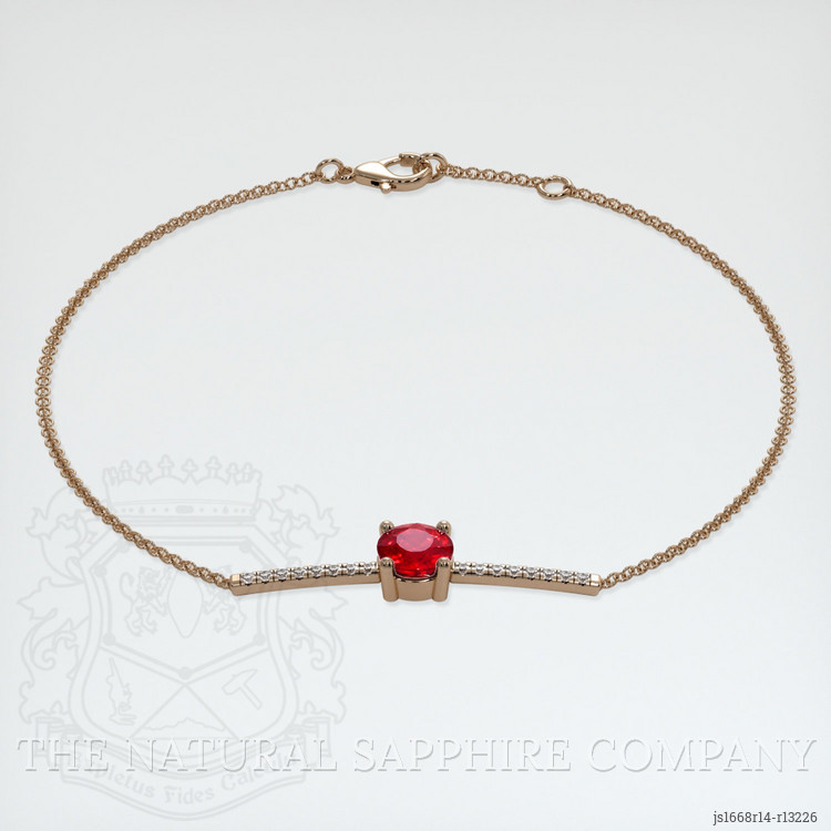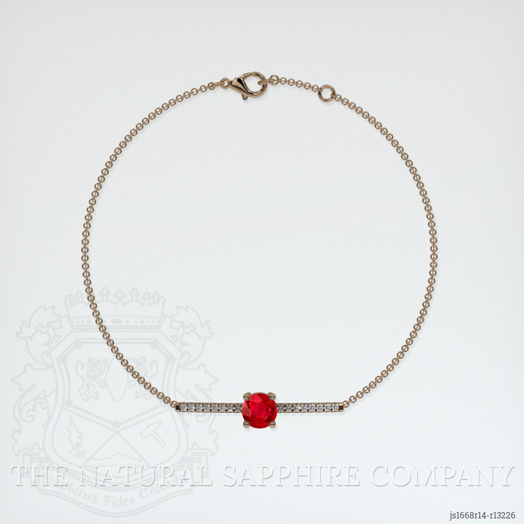 The bracelet features a beautiful, transparent Other certified Pinkish Red 1.20 carat round shape pinkish red ruby with the dimensions of 6.08 x 5.99 x 3.90 mm and a mixed brilliant cut. It has a clarity grade of very slightly included (evaluated at eye level), vivid color saturation, and an excellent polish. The origin of this ruby is Burma (Myanmar).