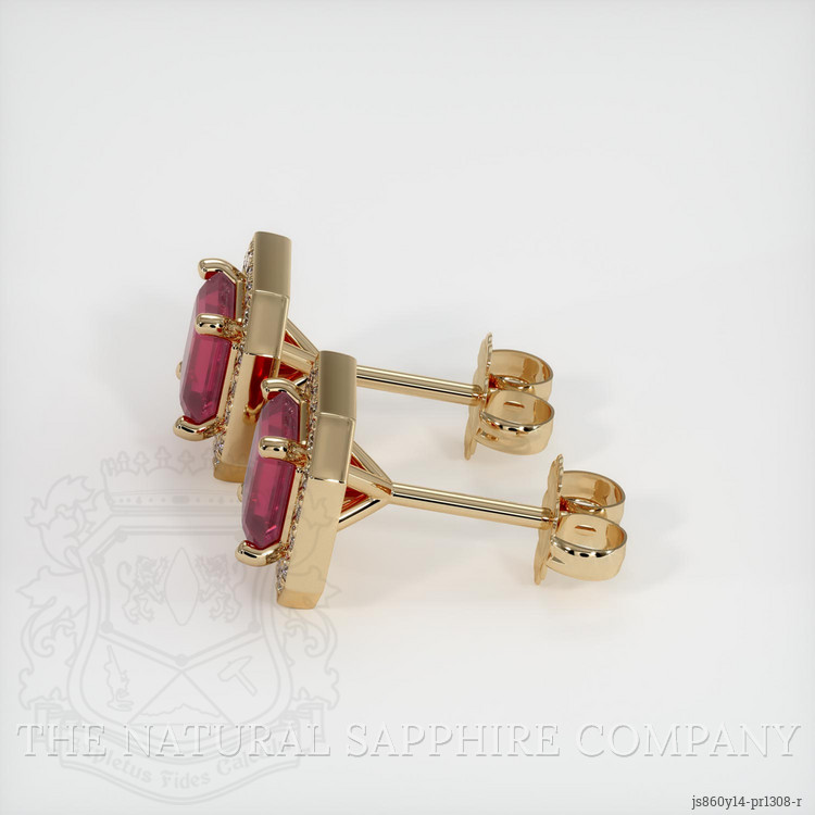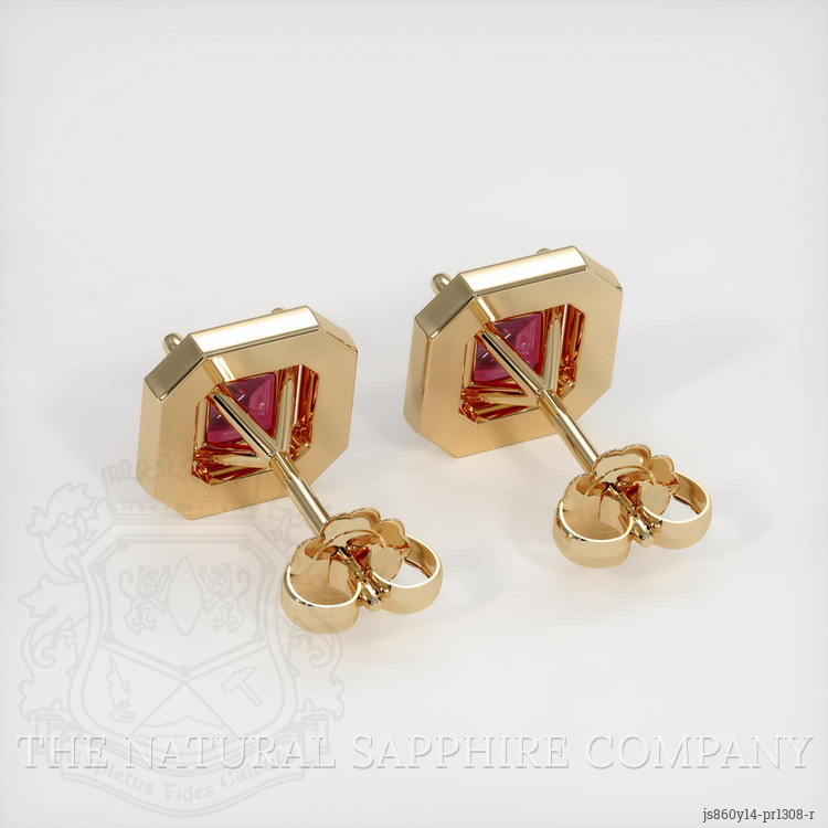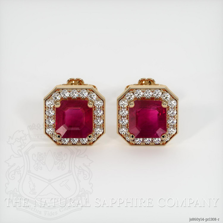 The earrings feature a beautiful, transparent pair of rubies that are 2.24 total carat weight. They are asscher - octagon shape pinkish red rubies, with the dimensions of 5.97 x 5.94 x 2.96 mm and are asscher cut, have a clarity grade of slightly included (evaluated at eye level), vivid color saturation, and an excellent polish. The origin of this pair of rubies is Burma (Myanmar).