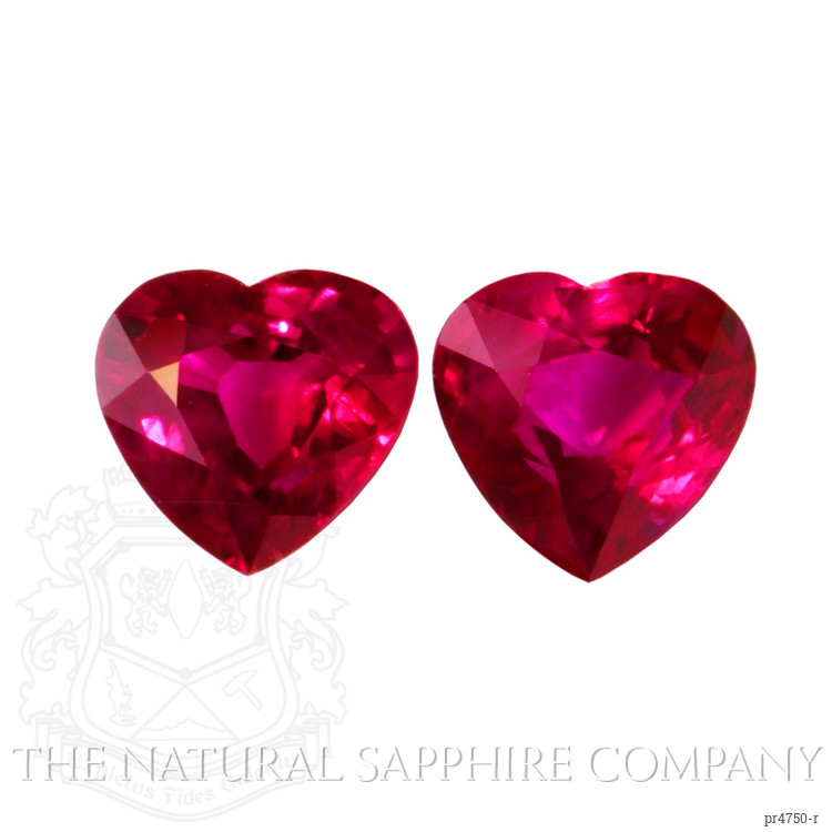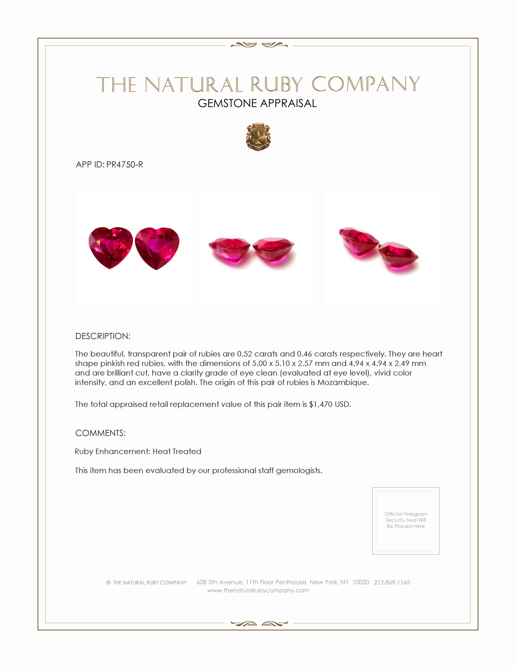 The earrings feature a beautiful, transparent pair of rubies that are 1.07 total carat weight. They are heart shape pinkish red rubies, with the dimensions of 4.84 x 5.03 x 2.99 mm and are brilliant cut, have a clarity grade of eye clean (evaluated at eye level), vivid color saturation, and an excellent polish. The origin of this pair of rubies is Mozambique.