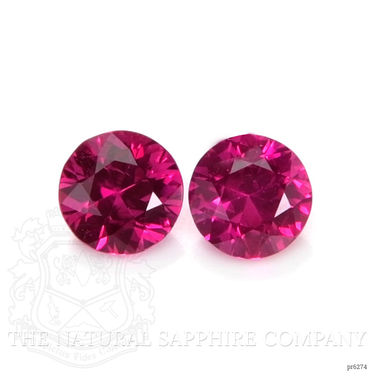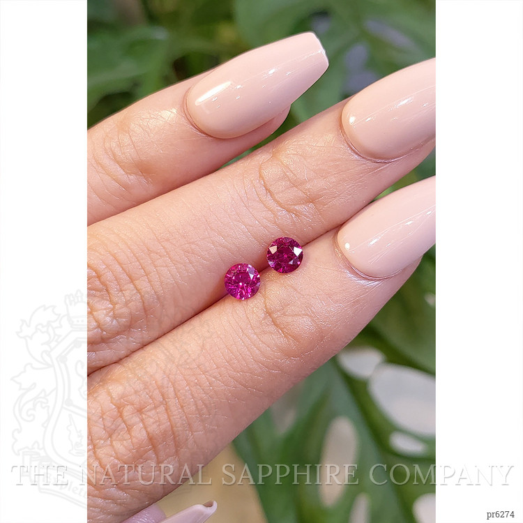 The earrings feature a beautiful, transparent pair of rubies that are 0.87 total carat weight. They are round shape pinkish red rubies, with the dimensions of 4.54 x 4.55 x 2.77 mm and are mixed brilliant cut, have a clarity grade of very slightly included (evaluated at eye level), intense color saturation, and an excellent polish. The origin of this pair of rubies is Mozambique.