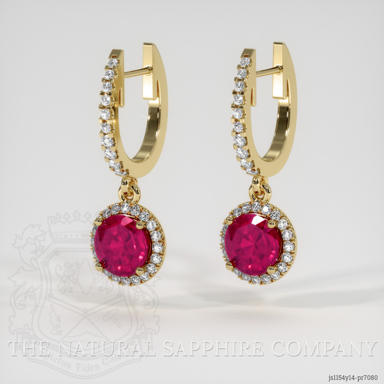 The earrings feature a beautiful, transparent pair of rubies that are 0.95 total carat weight. They are round shape pinkish red rubies, with the dimensions of 4.56 x 4.57 x 2.49 mm and are mixed brilliant cut, have a clarity grade of slightly included (evaluated at eye level), intense color saturation, and an excellent polish. The origin of this pair of rubies is Mozambique.