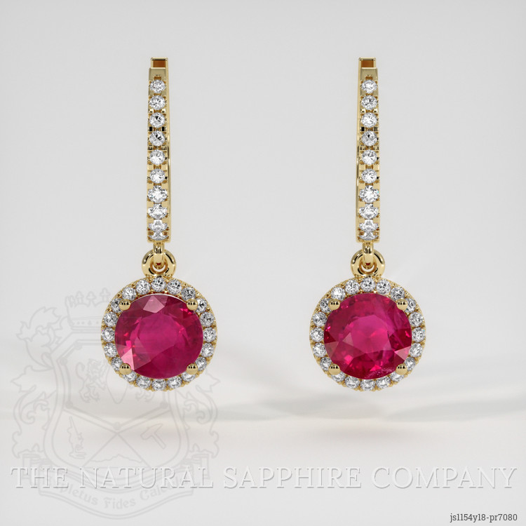 The earrings feature a beautiful, transparent pair of rubies that are 0.95 total carat weight. They are round shape pinkish red rubies, with the dimensions of 4.56 x 4.57 x 2.49 mm and are mixed brilliant cut, have a clarity grade of slightly included (evaluated at eye level), intense color saturation, and an excellent polish. The origin of this pair of rubies is Mozambique.