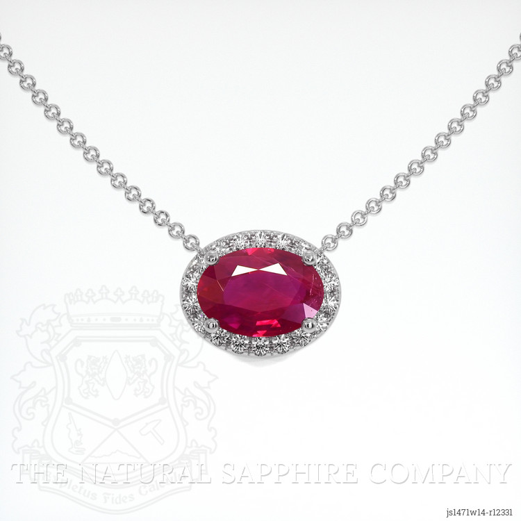 Steeped in the timeless allure of ancient lands, the pinkish red ruby at the heart of our exquisite necklace has its beginnings in the legendary hills of Burma (Myanmar). Measuring 0.82 carats, this captivating gem exudes an entirely unique charm, accentuated by the oval shape and mixed brilliant cut, which enhances its inherent beauty. The slightly included clarity adds character and depth, while the vivid color saturation brings forth a fiery intensity and light. Traditionally heralded as a symbol of power and passion, this ruby is infused with a legacy of history and mystery. The setting of 14K white gold serves as a lustrous canvas, magnifying the gem's natural radiance and bringing elegance to any attire it is paired with.