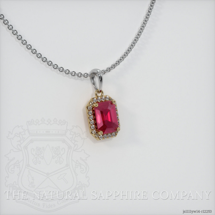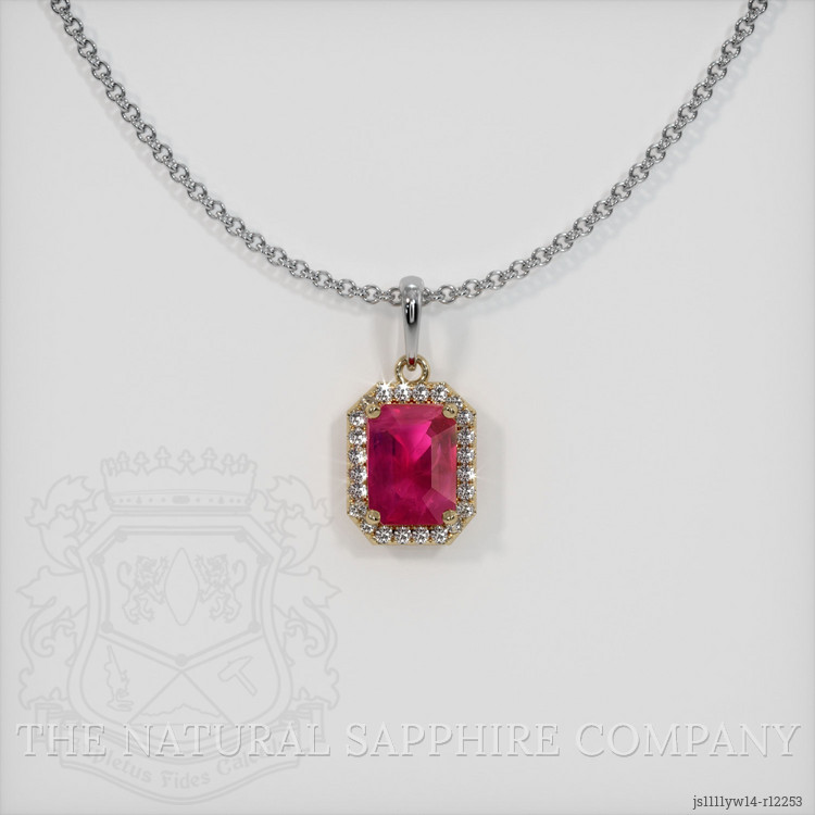 The pendant features a beautiful, transparent 1.08 carat emerald cut shape pinkish red ruby with the dimensions of 6.91 x 5.10 x 3.20 mm and a emerald cut. It has a clarity grade of very slightly included (evaluated at eye level), vivid color saturation, and an excellent polish. The origin of this ruby is Burma (Myanmar).