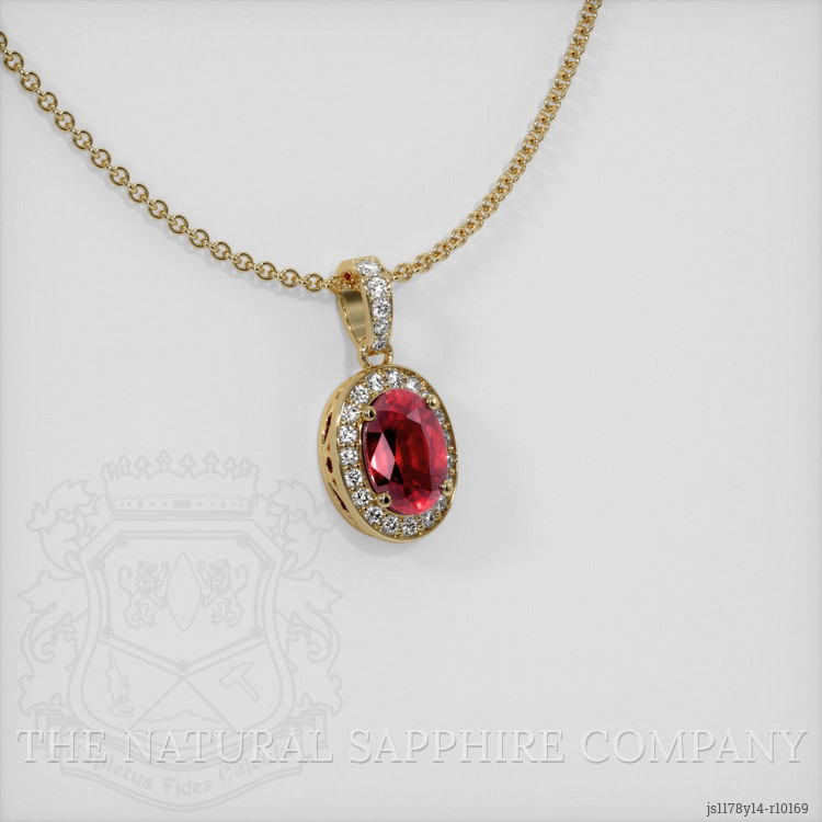 The pendant features a beautiful, transparent 1.05 carat oval shape pinkish red ruby with the dimensions of 7.05 x 5.02 x 3.54 mm and a mixed brilliant cut. It has a clarity grade of very slightly included (evaluated at eye level), vivid color saturation, and an excellent polish. The origin of this ruby is Burma (Myanmar).