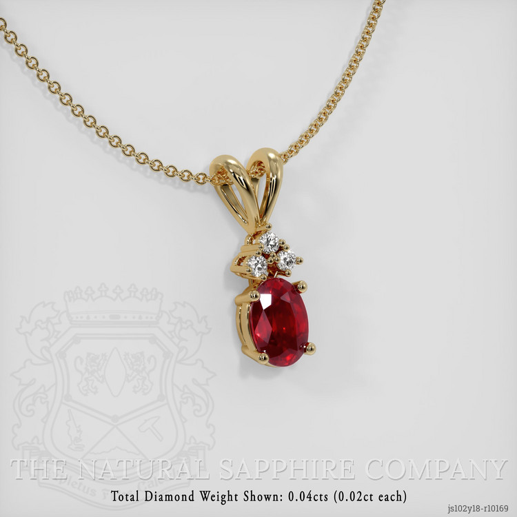 The pendant features a beautiful, transparent 1.05 carat oval shape pinkish red ruby with the dimensions of 7.05 x 5.02 x 3.54 mm and a mixed brilliant cut. It has a clarity grade of very slightly included (evaluated at eye level), vivid color saturation, and an excellent polish. The origin of this ruby is Burma (Myanmar).