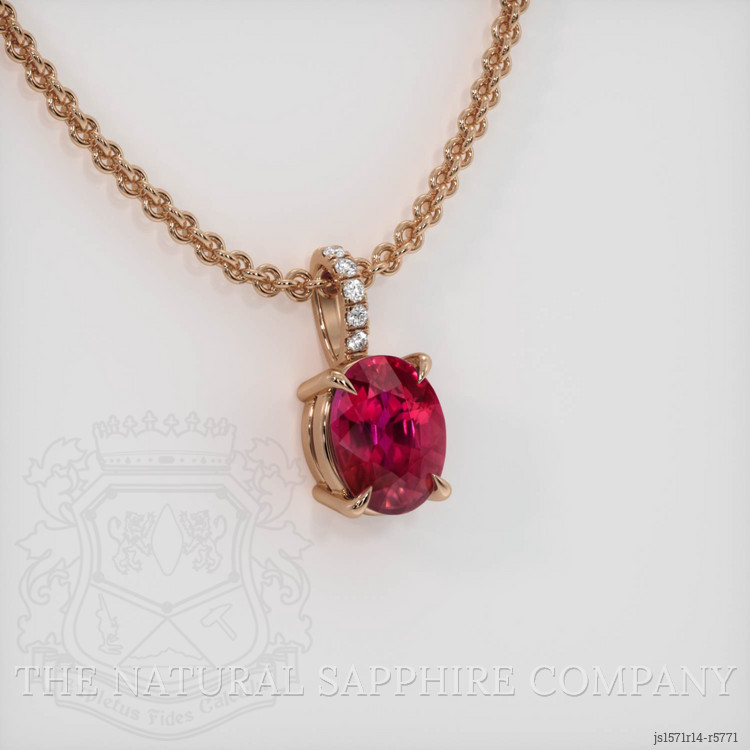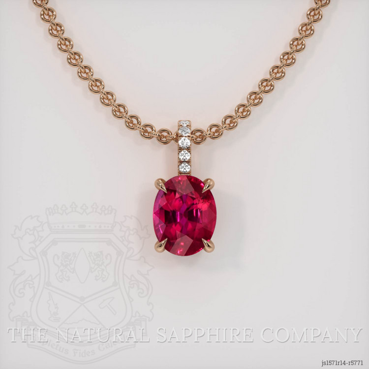 The pendant features a beautiful, transparent C.Dunaigre certified Vivid Pinkish-red 2.09 carat oval shape pinkish red ruby with the dimensions of 8.19 x 6.44 x 4.82 mm and a mixed brilliant cut. It has a clarity grade of very slightly included (evaluated at eye level), vivid color saturation, and an excellent polish. The origin of this ruby is Mozambique.