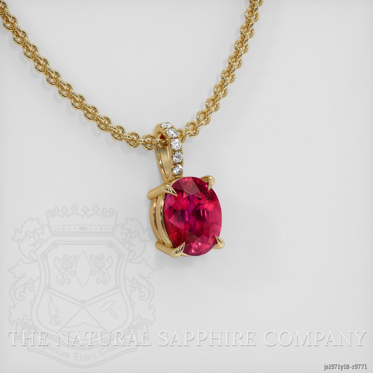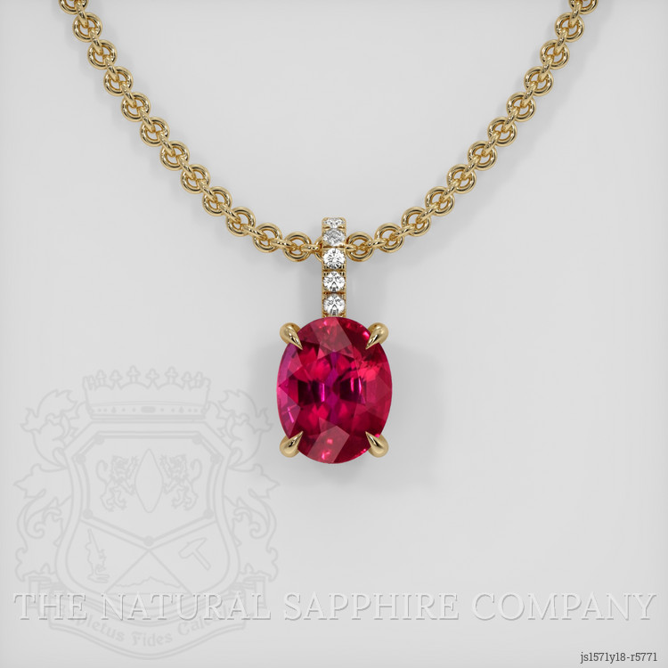 The pendant features a beautiful, transparent C.Dunaigre certified Vivid Pinkish-red 2.09 carat oval shape pinkish red ruby with the dimensions of 8.19 x 6.44 x 4.82 mm and a mixed brilliant cut. It has a clarity grade of very slightly included (evaluated at eye level), vivid color saturation, and an excellent polish. The origin of this ruby is Mozambique.