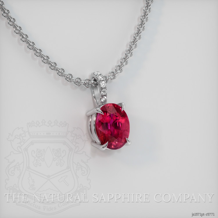 The pendant features a beautiful, transparent C.Dunaigre certified Vivid Pinkish-red 2.09 carat oval shape pinkish red ruby with the dimensions of 8.19 x 6.44 x 4.82 mm and a mixed brilliant cut. It has a clarity grade of very slightly included (evaluated at eye level), vivid color saturation, and an excellent polish. The origin of this ruby is Mozambique.