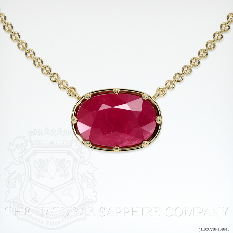 Elevate your elegance with the exquisite centerpiece of our Pensdent pendant, handcrafted to perfection by The Natural Ruby Company. This luxurious piece is set entirely in 14K yellow gold, showcasing an unforgettable 7.63-carat pinkish-red ruby that captivates at first glance. The mixed brilliant cut of this oval gem not only enhances its allure but also ensures that it shimmers with every movement, transforming any outfit into a statement. At dimensions of 13.95 x 9.33 x 6.11 mm, its generous size is designed to be a commanding presence, enhancing the natural beauty and sophistication of its wearer.