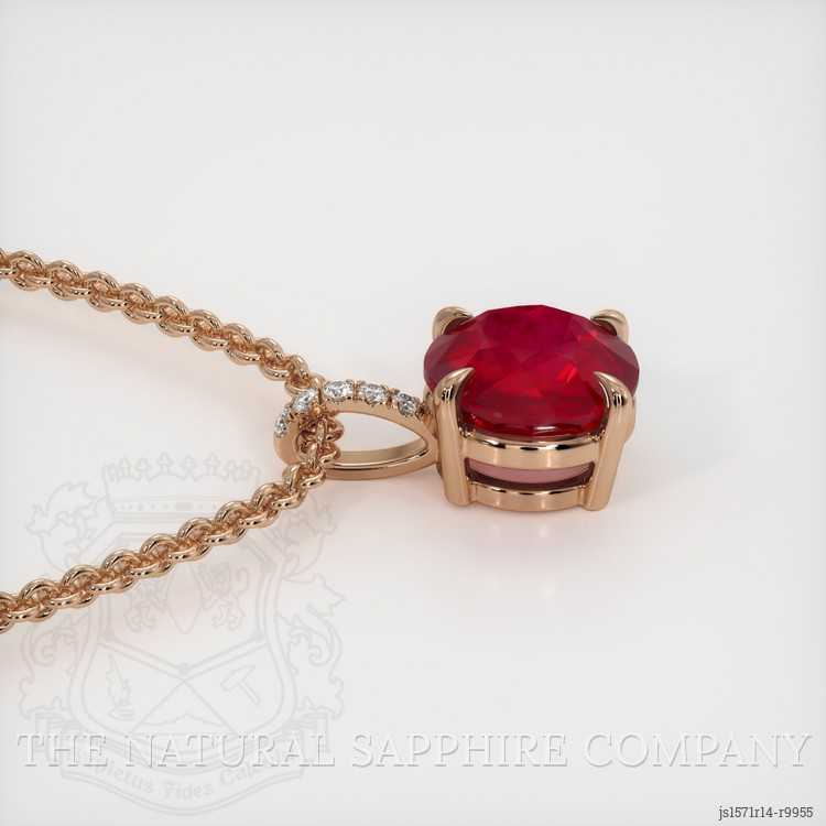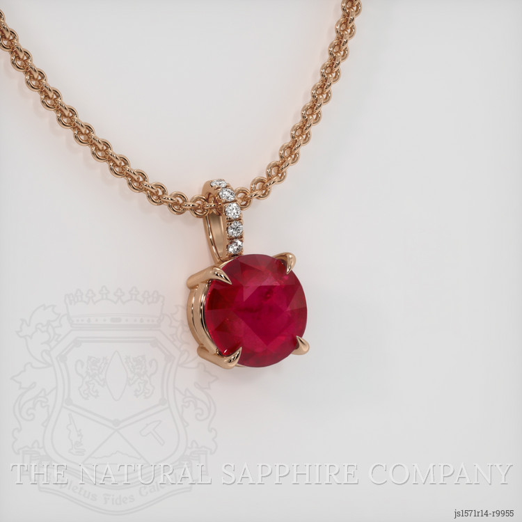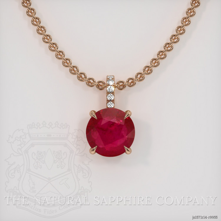 The pendant features a beautiful, transparent 2.76 carat round shape pinkish red ruby with the dimensions of 8.13 x 8.07 x 4.43 mm and a mixed brilliant cut. It has a clarity grade of slightly included (evaluated at eye level), vivid color saturation, and an excellent polish. The origin of this ruby is Mozambique.