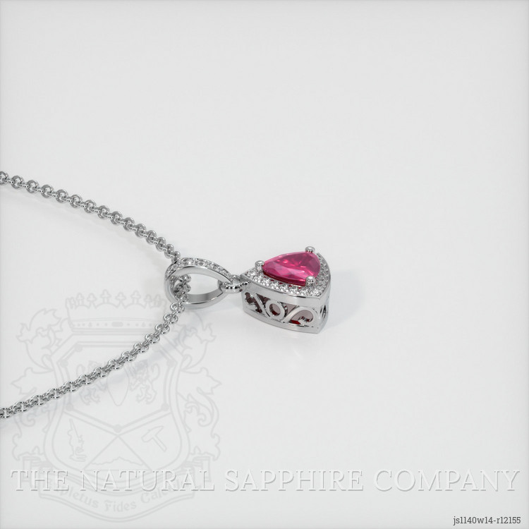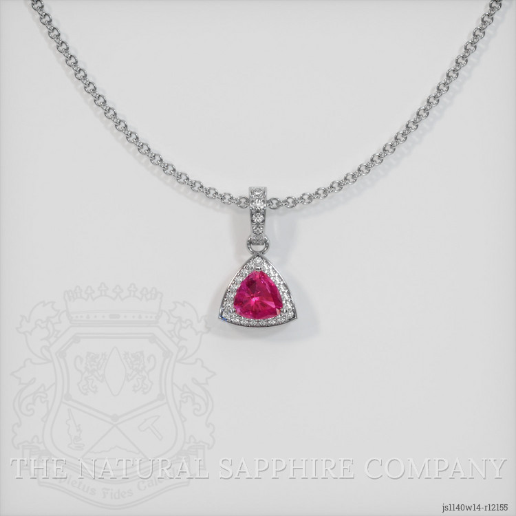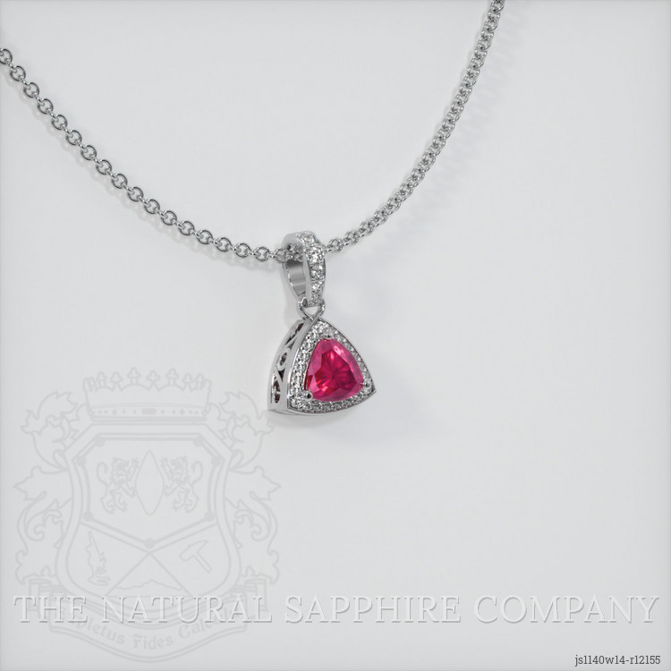 The pendant features a beautiful, transparent 0.47 carat trillion shape pinkish red ruby with the dimensions of 5.28 x 5.14 x 2.80 mm and a trillion cut. It has a clarity grade of slightly included (evaluated at eye level), vivid color saturation, and an excellent polish. The origin of this ruby is Burma (Myanmar).