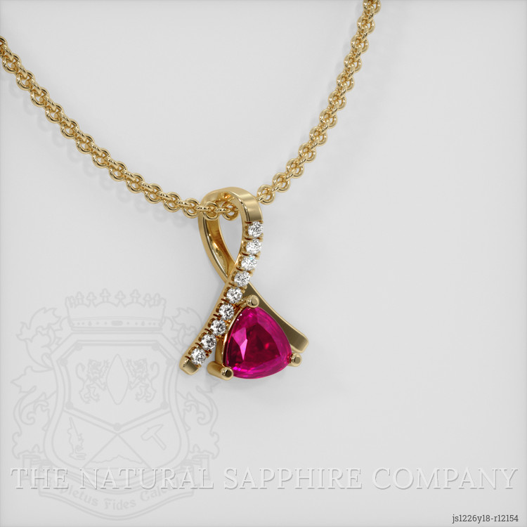 The pendant features a beautiful, transparent 0.56 carat trillion shape pinkish red ruby with the dimensions of 5.24 x 5.23 x 2.67 mm and a trillion cut. It has a clarity grade of eye clean (evaluated at eye level), vivid color saturation, and an excellent polish. The origin of this ruby is Burma (Myanmar).