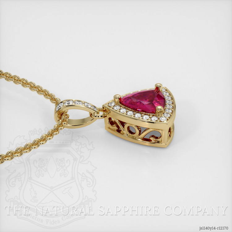 The pendant features a beautiful, transparent 1.16 carat trillion shape pinkish red ruby with the dimensions of 6.92 x 6.84 x 3.50 mm and a trillion cut. It has a clarity grade of very slightly included (evaluated at eye level), vivid color saturation, and an excellent polish. The origin of this ruby is Burma (Myanmar).
