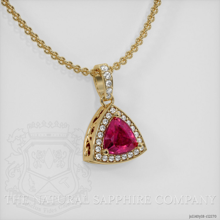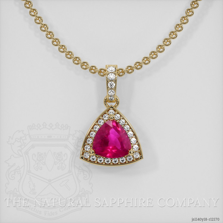 The pendant features a beautiful, transparent 1.16 carat trillion shape pinkish red ruby with the dimensions of 6.92 x 6.84 x 3.50 mm and a trillion cut. It has a clarity grade of very slightly included (evaluated at eye level), vivid color saturation, and an excellent polish. The origin of this ruby is Burma (Myanmar).