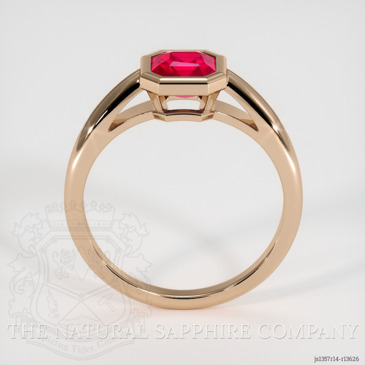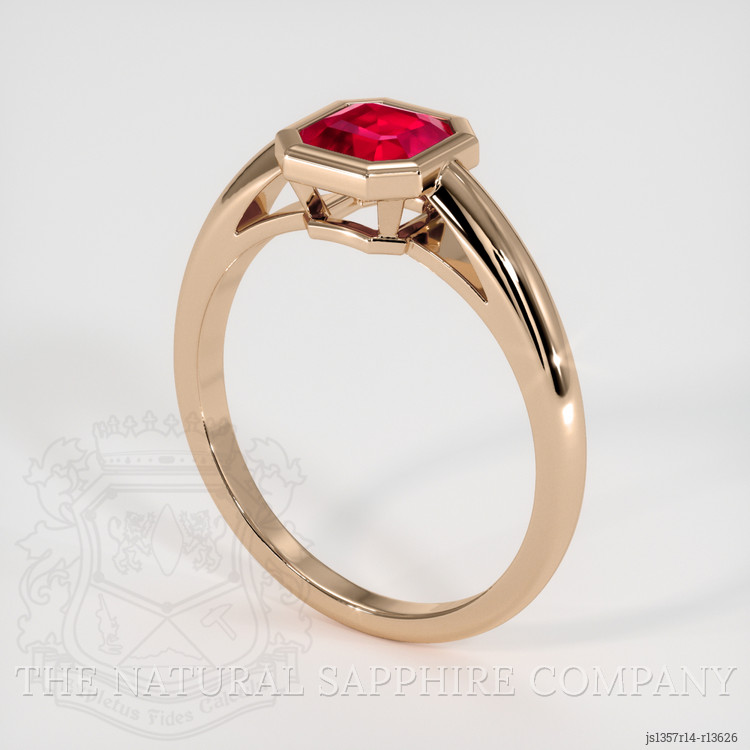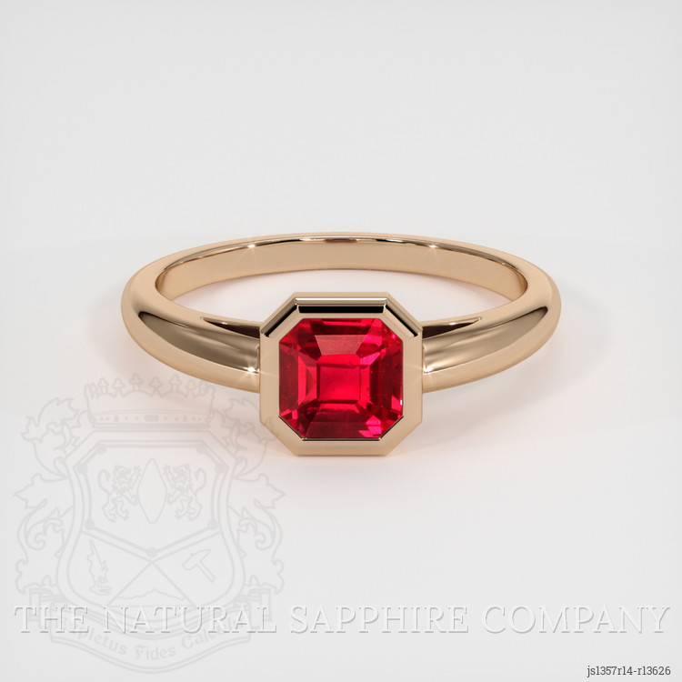 The men's ring features a beautiful, transparent 1.03-carat Asscher - octagon shape pinkish-red ruby with the dimensions of 5.54 x 5.51 x 3.47 mm and an Asscher cut. It has a clarity grade of eye clean (evaluated at eye level), vivid color saturation, and an excellent polish. The origin of this ruby is Mozambique. The ring is entirely set in 14K rose gold. The Asscher cut highlights the ruby's clarity, allowing maximum light reflection, giving it a rich and deep color tone. Eye clean clarity ensures that there are no visible inclusions to the naked eye, providing an uninterrupted view of its splendid color. The polished finish of the ring enhances the lustrous appeal of the rose gold band, offering a perfect complement to the vibrant ruby. Mozambican rubies are known for their superior quality, and this ring exemplifies this standard. The combination of the elegant Asscher cut and the warm hue of rose gold makes this ring a refined choice for discerning tastes.