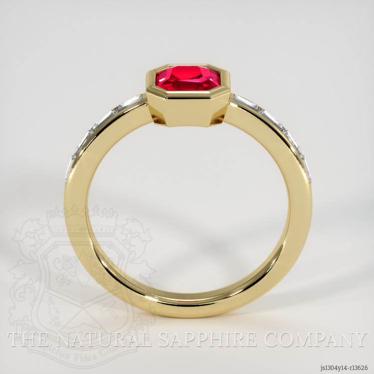 The intricate craftsmanship does not end with the ruby itself. Accentuating this centerpiece are exquisite white baguette diamonds, elegantly set to enhance the ring's luxurious appeal. Weighing approximately 0.40 carats, these baguette diamonds possess a Very Slightly Included (VS1, VS2) clarity grade and exhibit an exceptional E color grade. Their precise straight shape harmonizes with the ruby, adding a linear yet sophisticated flair that underscores the ring's refined aesthetics. Each diamond is strategically placed to complement the Asscher-cut ruby, culminating in a harmonious design that balances boldness with elegance.