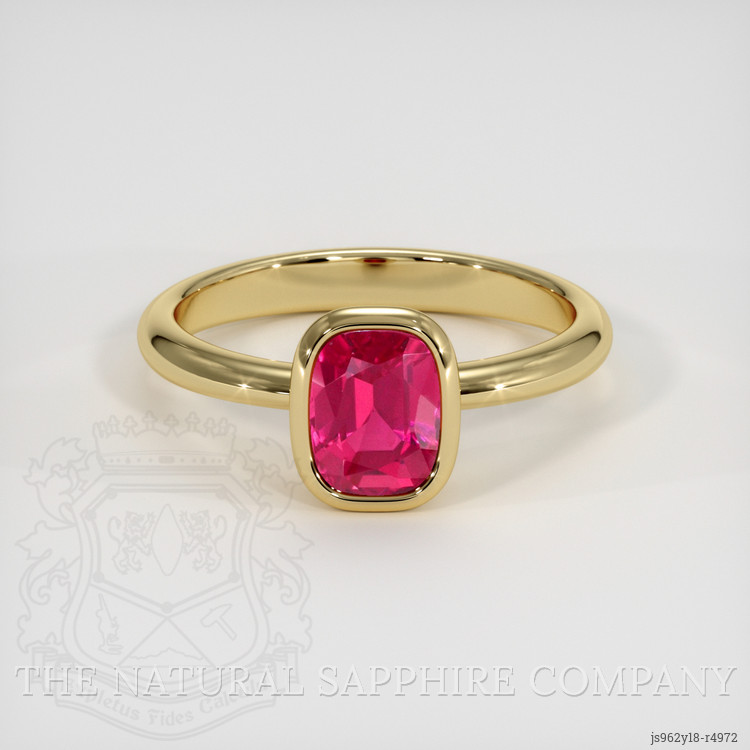 Prominent within the design is the setting of the ring, which is entirely cast in 18K yellow gold. This choice of metal complements the vibrant tones of the ruby, forming a backdrop that enhances its visual impact. The ring’s design is a fusion of sophistication and timeless grace, appealing to those who appreciate understated luxury. The choice of 18K gold ensures durability while radiating a warm luster, perfectly matching the gemstone it holds.