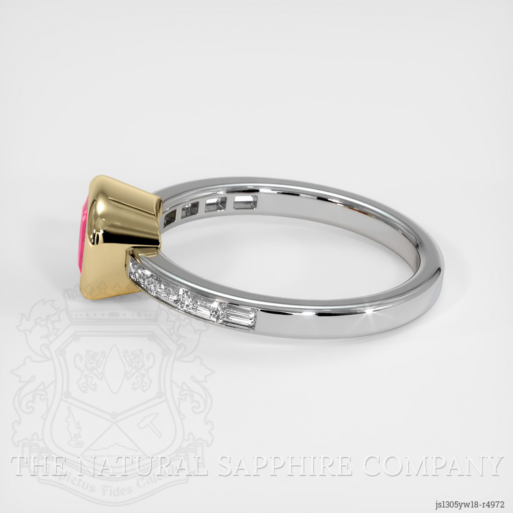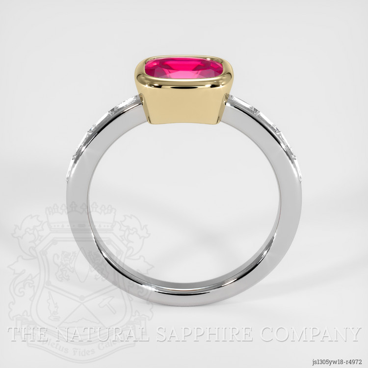 The ring features a beautiful, transparent AGL certified Pink-Red 1.70 carat cushion shape pinkish red ruby with the dimensions of 7.20 x 5.53 x 4.37 mm and a mixed brilliant cut. It has a clarity grade of very slightly included (evaluated at eye level), intense color saturation, and an excellent polish. The origin of this ruby is Burma (Myanmar).