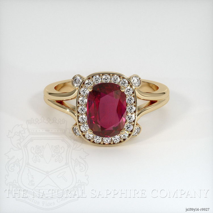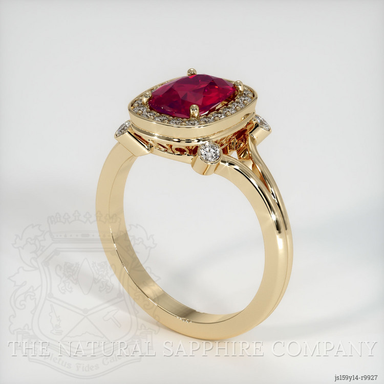 The ring features a beautiful, transparent GIA certified Red 2.20 carat cushion shape pinkish red ruby with the dimensions of 8.90 x 6.31 x 3.74 mm and a mixed brilliant cut. It has a clarity grade of very slightly included (evaluated at eye level), intense color saturation, and an excellent polish. The origin of this ruby is Mozambique.