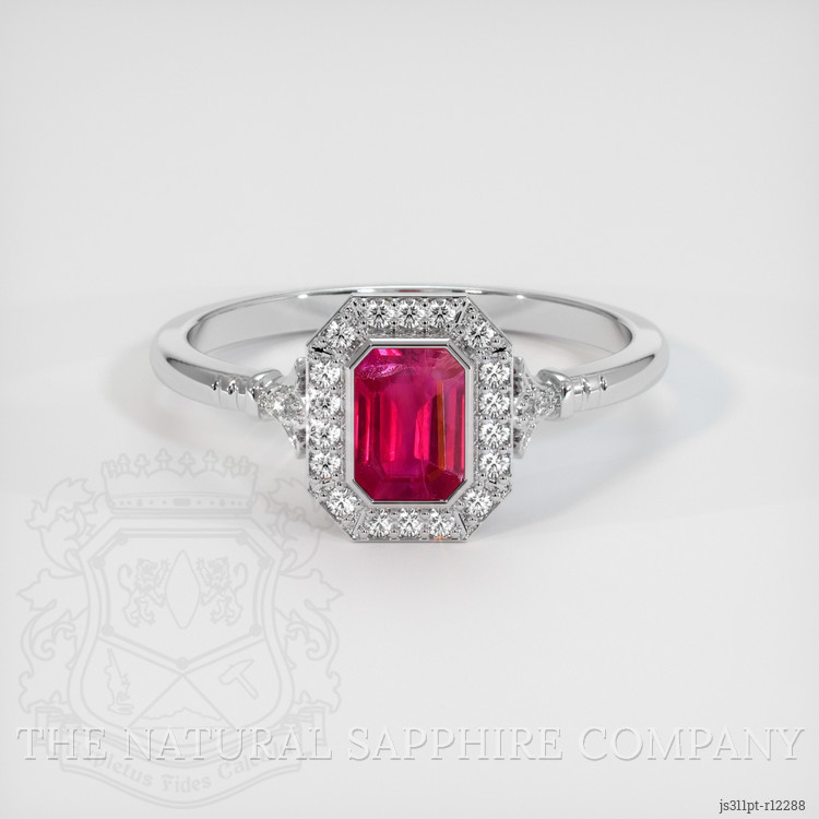 The ring features a beautiful, transparent 0.98 carat emerald cut shape pinkish red ruby with the dimensions of 6.95 x 4.96 x 2.82 mm and a emerald cut. It has a clarity grade of very slightly included (evaluated at eye level), vivid color saturation, and an excellent polish. The origin of this ruby is Burma (Myanmar).