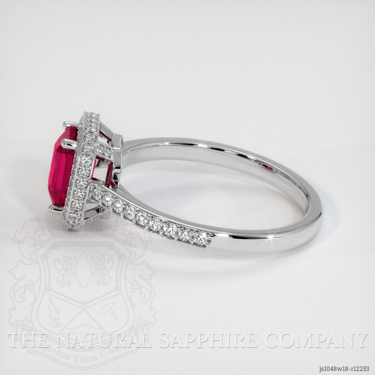 The ring features a beautiful, transparent 1.08 carat emerald cut shape pinkish red ruby with the dimensions of 6.91 x 5.10 x 3.20 mm and a emerald cut. It has a clarity grade of very slightly included (evaluated at eye level), vivid color saturation, and an excellent polish. The origin of this ruby is Burma (Myanmar).