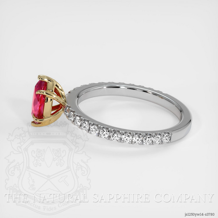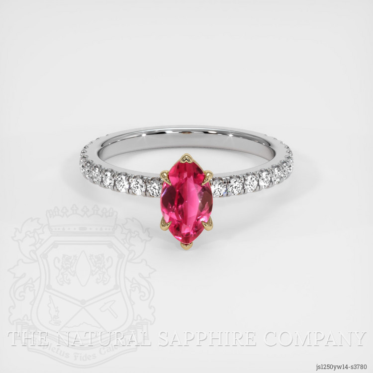 The ring features a beautiful, transparent 0.82 carat marquise shape pinkish red ruby with the dimensions of 7.77 x 4.66 x 2.86 mm and a mixed brilliant cut. It has a clarity grade of very slightly included (evaluated at eye level), medium intense color saturation, and an excellent polish. The origin of this ruby is Thailand (Siam).
