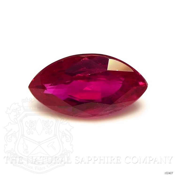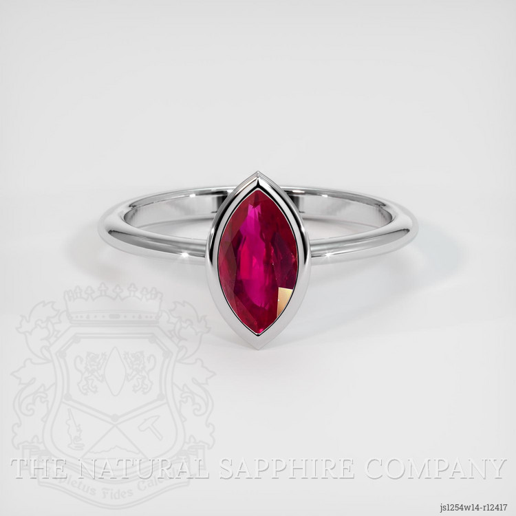 The ring features a beautiful, transparent 1.24 carat marquise shape pinkish red ruby with the dimensions of 9.12 x 5.00 x 3.47 mm and a mixed brilliant cut. It has a clarity grade of very slightly included (evaluated at eye level), vivid color saturation, and an excellent polish. The origin of this ruby is Mozambique.