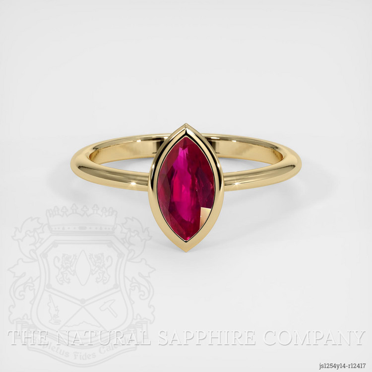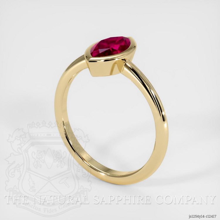 The ring features a beautiful, transparent 1.24 carat marquise shape pinkish red ruby with the dimensions of 9.12 x 5.00 x 3.47 mm and a mixed brilliant cut. It has a clarity grade of very slightly included (evaluated at eye level), vivid color saturation, and an excellent polish. The origin of this ruby is Mozambique.