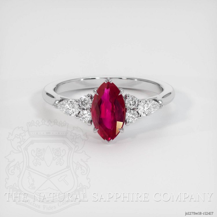 The ring features a beautiful, transparent 1.24 carat marquise shape pinkish red ruby with the dimensions of 9.12 x 5.00 x 3.47 mm and a mixed brilliant cut. It has a clarity grade of very slightly included (evaluated at eye level), vivid color saturation, and an excellent polish. The origin of this ruby is Mozambique.