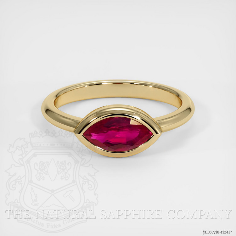 The ring features a beautiful, transparent 1.24 carat marquise shape pinkish red ruby with the dimensions of 9.12 x 5.00 x 3.47 mm and a mixed brilliant cut. It has a clarity grade of very slightly included (evaluated at eye level), vivid color saturation, and an excellent polish. The origin of this ruby is Mozambique.