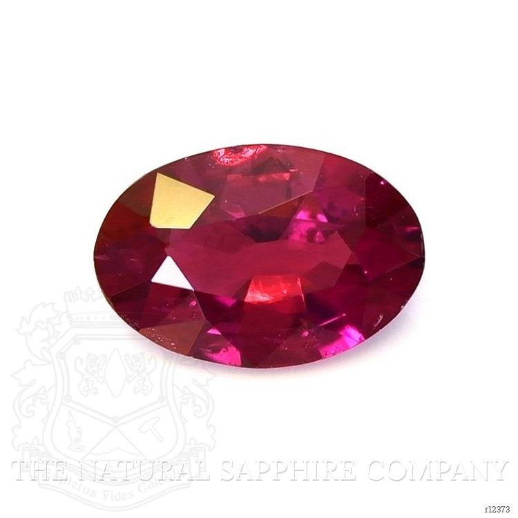 The ring features a beautiful, transparent 0.43 carat oval shape pinkish red ruby with the dimensions of 5.91 x 4.02 x 2.39 mm and a mixed brilliant cut. It has a clarity grade of very slightly included (evaluated at eye level), vivid color saturation, and an excellent polish. The origin of this ruby is Thailand (Siam).