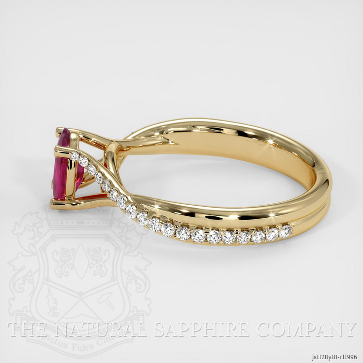 The ring features a beautiful, transparent 0.70 carat oval shape pinkish red ruby with the dimensions of 6.99 x 4.90 x 2.51 mm and a mixed brilliant cut. It has a clarity grade of very slightly included (evaluated at eye level), vivid color saturation, and an excellent polish. The origin of this ruby is Burma (Myanmar).