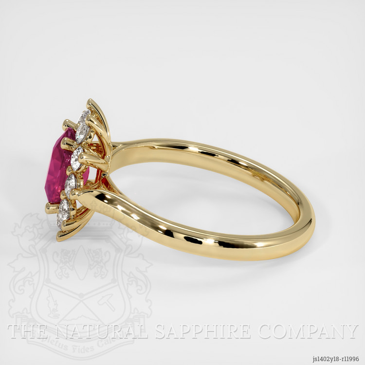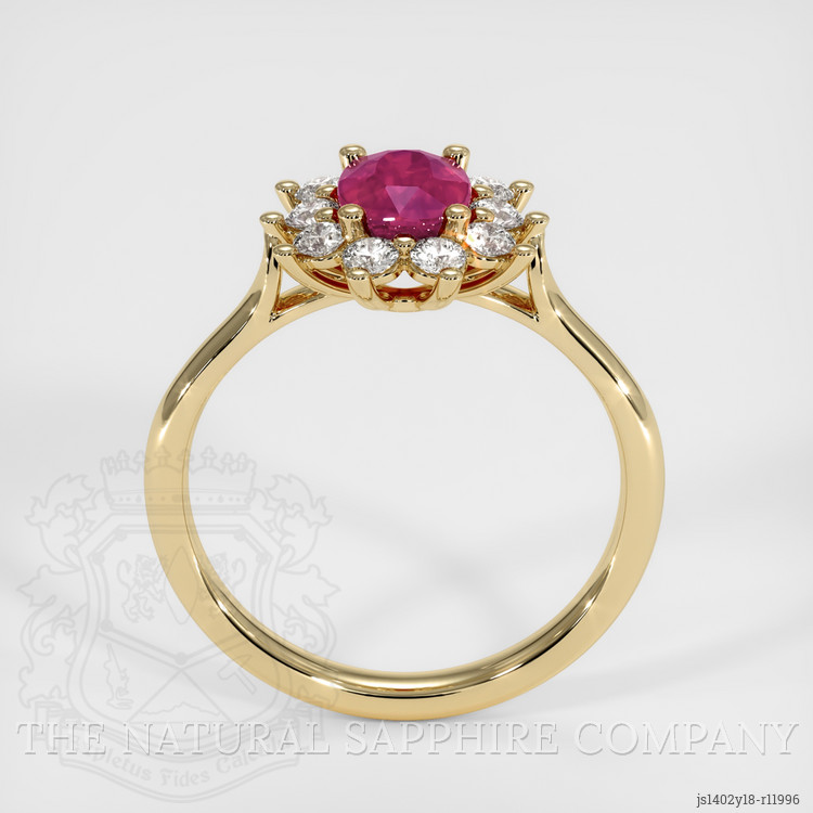 The ring features a beautiful, transparent 0.70 carat oval shape pinkish red ruby with the dimensions of 6.99 x 4.90 x 2.51 mm and a mixed brilliant cut. It has a clarity grade of very slightly included (evaluated at eye level), vivid color saturation, and an excellent polish. The origin of this ruby is Burma (Myanmar).