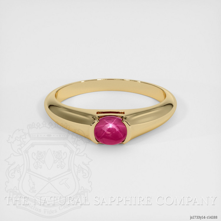 The men's ring is crafted with a 0.73 carat semi-translucent ruby, measuring 5.36 x 4.14 x 3.05 mm, featuring a cabochon cut. The ruby's slight inclusions are evaluated at eye level, with intense color saturation and excellent polish. This gemstone originates from Mozambique. Set in 14K yellow gold, the band's smoothness ensures comfortable daily wear, enhancing both style and practicality. The thoughtful design integrates the gem flawlessly into the elegant structure, resulting in a timeless piece. This ring combines quality and precision in every detail, making it a distinguished addition to any collection.