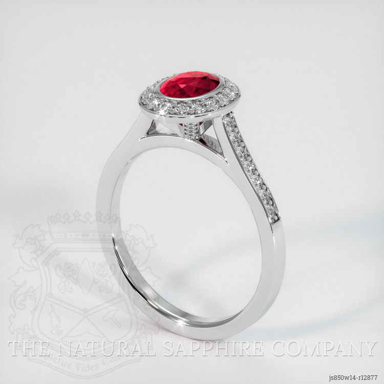 The ring features a beautiful, transparent 1.14 carat oval shape pinkish red ruby with the dimensions of 6.39 x 4.85 x 3.75 mm and a mixed brilliant cut. It has a clarity grade of very slightly included (evaluated at eye level), vivid color saturation, and an excellent polish. The origin of this ruby is Thailand (Siam).