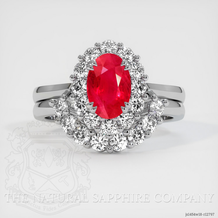 The ring features a beautiful, transparent 1.17 carat oval shape pinkish red ruby with the dimensions of 7.80 x 5.74 x 3.11 mm and a mixed brilliant cut. It has a clarity grade of slightly included (evaluated at eye level), vivid color saturation, and an excellent polish. The origin of this ruby is Mozambique.