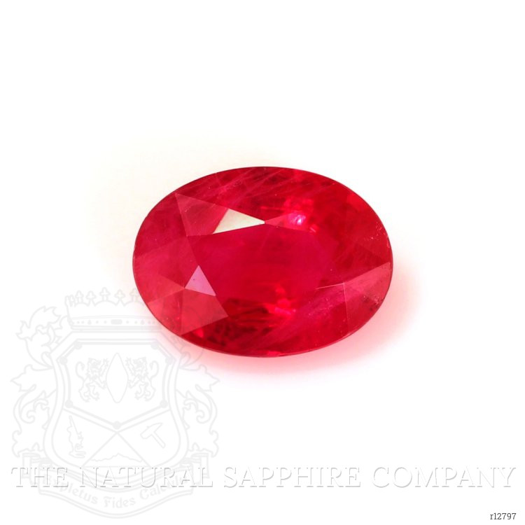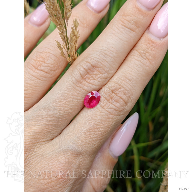 The ring features a beautiful, transparent 1.17 carat oval shape pinkish red ruby with the dimensions of 7.80 x 5.74 x 3.11 mm and a mixed brilliant cut. It has a clarity grade of slightly included (evaluated at eye level), vivid color saturation, and an excellent polish. The origin of this ruby is Mozambique.