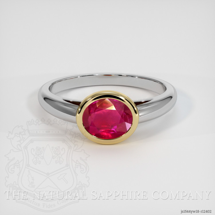 The ring itself is a masterclass in craftsmanship, set entirely in a blend of 18K yellow gold and 18K white gold. The yellow gold bezel setting cradles the ruby, enhancing its striking color, while the white gold band provides a sleek, modern contrast. The ring is polished to perfection, ensuring a mirror-like finish. This combination of metals not only adds to the ring's aesthetic appeal but also ensures its lasting durability.