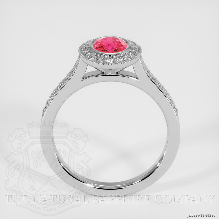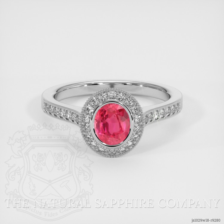 The ring features a beautiful, transparent 1.20 carat oval shape pinkish red ruby with the dimensions of 6.58 x 5.30 x 3.79 mm and a mixed brilliant cut. It has a clarity grade of very slightly included (evaluated at eye level), intense color saturation, and an excellent polish. The origin of this ruby is Mozambique.
