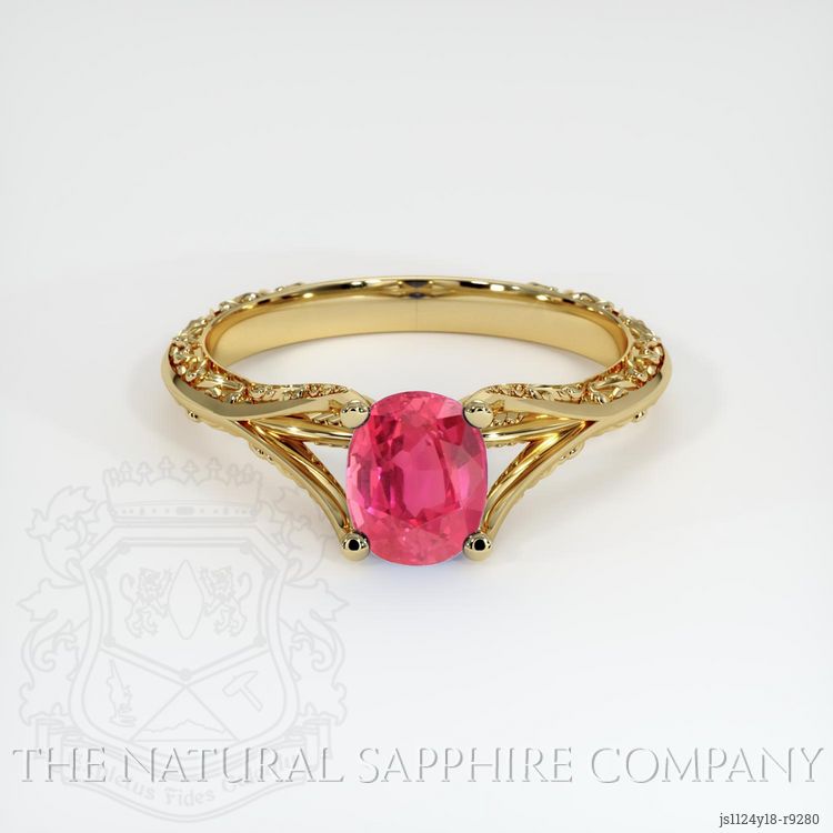 The ring features a beautiful, transparent 1.20 carat oval shape pinkish red ruby with the dimensions of 6.58 x 5.30 x 3.79 mm and a mixed brilliant cut. It has a clarity grade of very slightly included (evaluated at eye level), intense color saturation, and an excellent polish. The origin of this ruby is Mozambique.