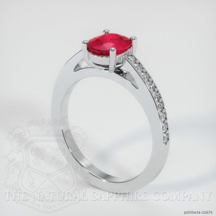The ring features a beautiful, transparent 1.59 carat oval shape pinkish red ruby with the dimensions of 7.23 x 6.10 x 3.87 mm and a mixed brilliant cut. It has a clarity grade of very slightly included (evaluated at eye level), intense color saturation, and an excellent polish. The origin of this ruby is Thailand (Siam).