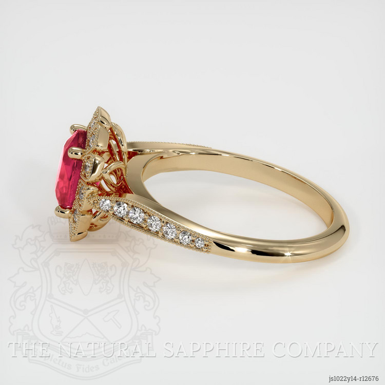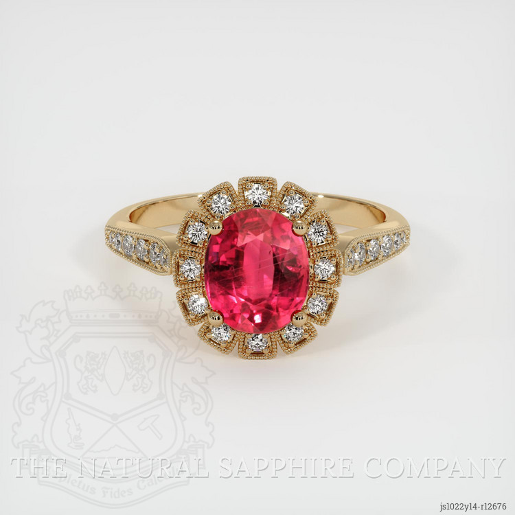 The ring features a beautiful, transparent 1.59 carat oval shape pinkish red ruby with the dimensions of 7.23 x 6.10 x 3.87 mm and a mixed brilliant cut. It has a clarity grade of very slightly included (evaluated at eye level), intense color saturation, and an excellent polish. The origin of this ruby is Thailand (Siam).