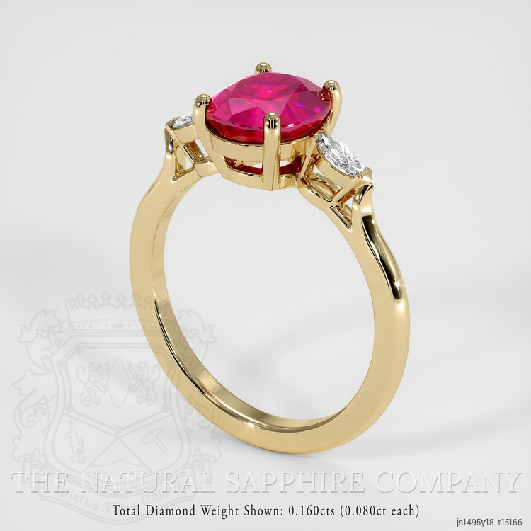 The regal elegance of this exquisite ring elevates it to a class of its own, truly making it a treasure for connoisseurs of fine jewelry. At the heart of this masterpiece from The Natural Ruby Company lies a breathtaking 1.98 carat oval-shaped ruby, sourced from the esteemed mines of Mozambique. Its dimensions, 7.77 x 6.72 x 4.45 mm, combined with a mixed brilliant cut, create a dazzling symphony of light and color that is further accentuated by its intense pinkish-red hue. The heat-treated enhancement enriches its color intensity, enhancing the gemstone's natural allure and impact.
