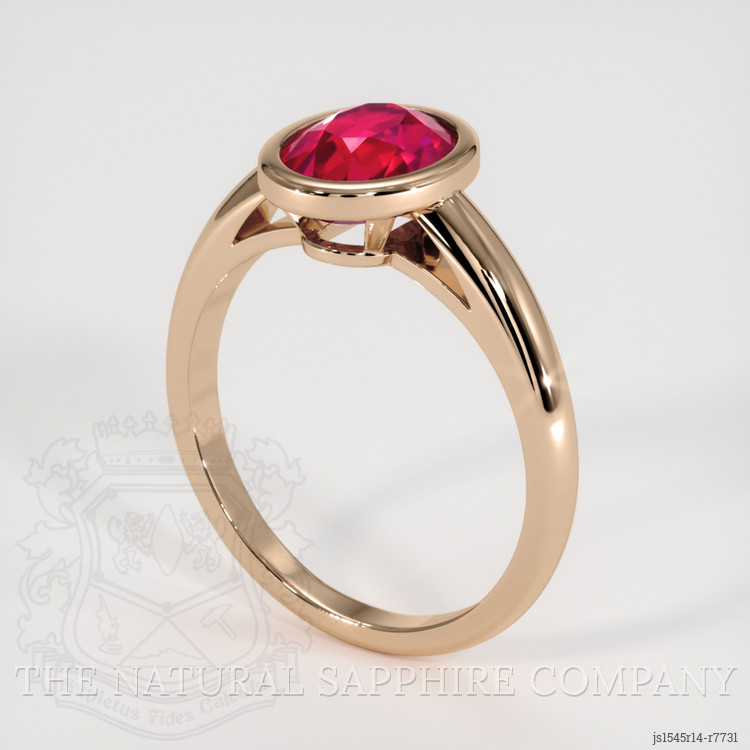 This exquisite gem is cradled in an elegant setting of 18K Rose gold, a metal chosen for its warm, rosy hue that complements the ruby's rich color. The rose gold is meticulously crafted, polished to an excellent finish that not only adds to the aesthetic appeal but also ensures comfort and durability for the wearer. The clean lines and classic design of the band speak to a timeless elegance, allowing the ruby to take center stage.