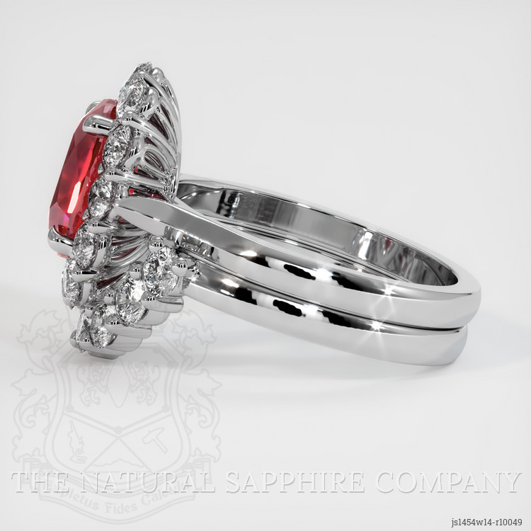 The ring features a beautiful, transparent Other certified Red 2.60 carat oval shape pinkish red ruby with the dimensions of 9.71 x 6.37 x 4.28 mm and a mixed brilliant cut. It has a clarity grade of very slightly included (evaluated at eye level), intense color saturation, and an excellent polish. The origin of this ruby is Thailand (Siam).