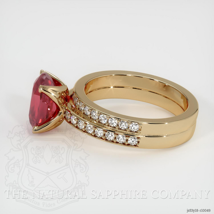 The ring features a beautiful, transparent Other certified Red 2.60 carat oval shape pinkish red ruby with the dimensions of 9.71 x 6.37 x 4.28 mm and a mixed brilliant cut. It has a clarity grade of very slightly included (evaluated at eye level), intense color saturation, and an excellent polish. The origin of this ruby is Thailand (Siam).