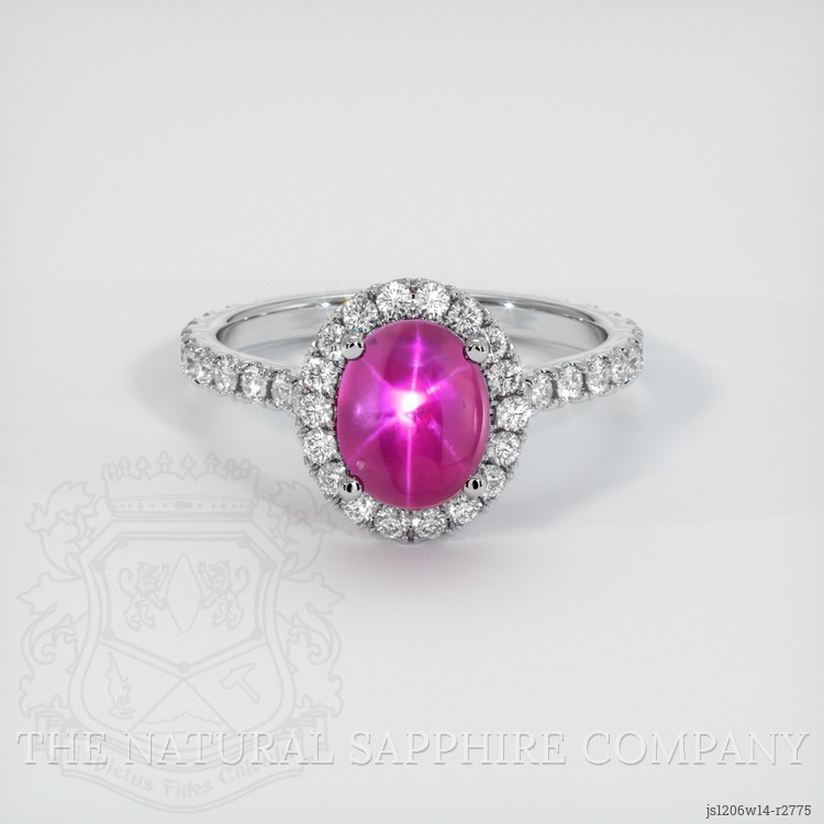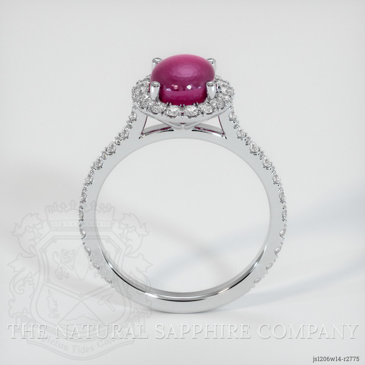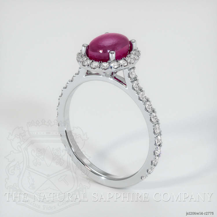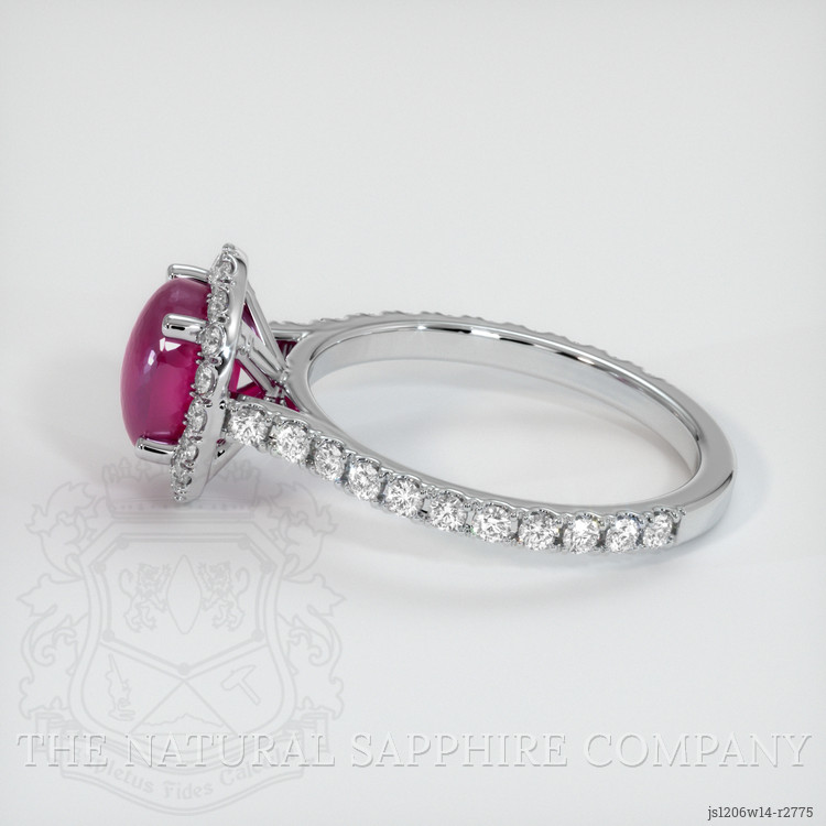 The ring features a beautiful, opaque 2.61 carat oval shape pinkish red ruby with the dimensions of 7.60 x 6.05 x 4.81 mm and a cabochon cut. It has a clarity grade of very slightly included (evaluated at eye level), vivid color saturation, and an excellent polish. The origin of this ruby is Burma (Myanmar).