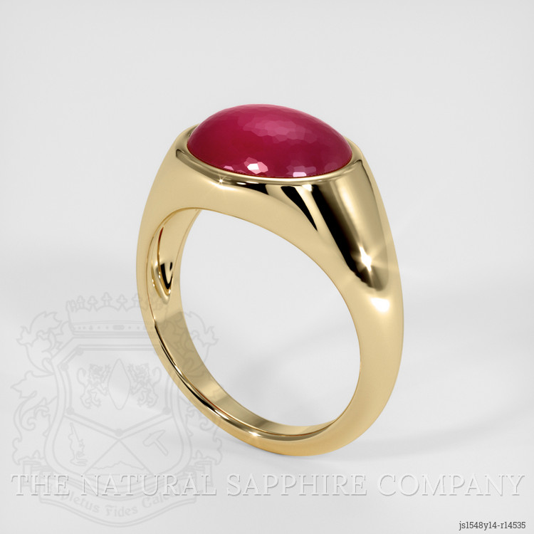 Throughout history, gemstones have been cherished for their enduring allure and symbolism, and the ruby in particular has held a place of prominence as a symbol of passion and vitality. At The Natural Ruby Company, we are proud to present a majestic men's ring that embodies these timeless qualities. The centerpiece of this elegant piece is a remarkable 3.76 carat pinkish red ruby, originating from the storied lands of Vietnam, a region renowned for producing some of the finest rubies in the world. This exquisite gemstone, with dimensions of 11.18 x 8.84 x 3.68 mm, features an opaque cabochon cut that beautifully enhances its natural richness and depth. Its vivid and intense color saturation captivates the eye, creating a sense of warmth and opulence.